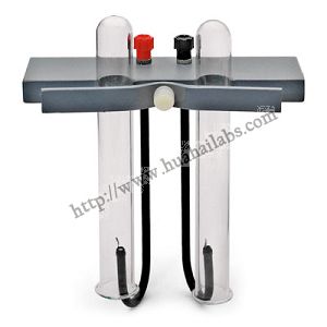 Platinum electrodes are attached to insulated connecting rods which are attached to binding posts mounted on a non-conducting support. The support rests across the top of a battery jar (not included) and has 2 clips that hold 2 inverted test tubes. The unit operates on a 6V battery or 10V DC power supply