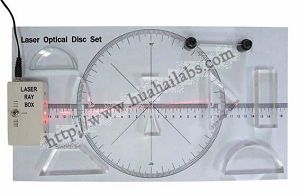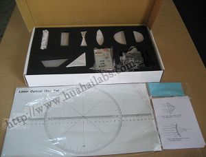 A vinyl template with a degree circle and a linear scale forms the optical disk, and the set includes seven clear acrylic optical elements and a mirror with adjustable curvature for investigating refraction, lenses, prisms and mirrors. The bottoms of the acrylic elements are frosted to show the ray paths inside them. The set also includes a manual and storage box.