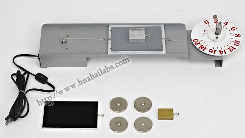 1. Friction test bed: (1) Bench, (2) 110V/220V Power cord (3) Power switch (4) Large winch shaft (5) Small winch shaft (6) Thin thread with hooks (7) Force measurement meter: accuracy of 0.02N.