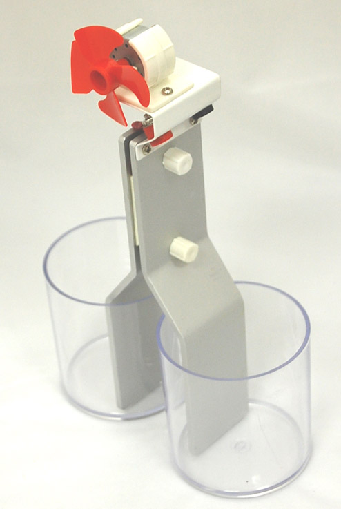 This smart little demo is designed to be immersed in 2-3" of water, each aluminum "leg" being immersed in one of the included plastic cups. Immerse the generator in cups of water of equal temperature, and nothing happens. Immerse the generator in cups of water with a substantial temperature gradient (hot or cold), and the fan will begin to spin after a few minutes. Has 4mm DC input/output terminals and switch to redirect electricity to/from these terminals. The output from these terminals can be hooked up to a meter for measurement, allowing the user to monitor temperature gradient and output data.