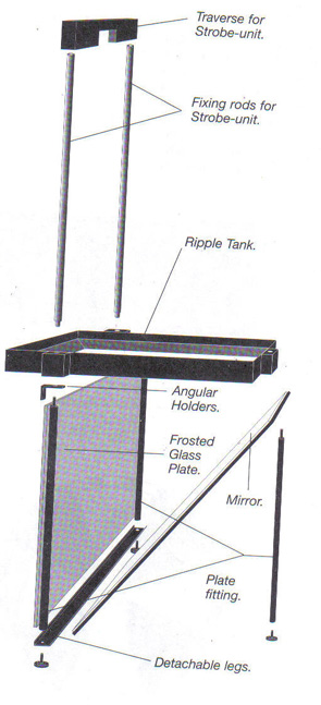 Used for the visual demonstration of the properties of wave motion and the effects of refraction, diffraction and interference. Water tank: Frame of plastic which pastes transparent glass plate, size for 38x31.5x2.6 Cm, Frequency flash source: the size is 18x7.7x7.7 cm, rotational speed by 6 to 99Hz adjustable. It has the synchronized electricity output, and causes the oscillator for synchronization. This use the power source is DC 12V-4.7A. It has the oscillator, the gearing cross rod, the remote control, the wave matches, anti-appendices, wave fitting, reflector, projection board etc