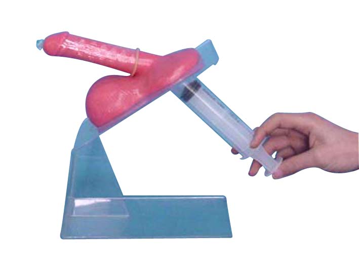 This model facilitates teaching the use of condoms for safer sex. The plastic stand has suction caps to hold it securely to a table during use. A firm plastic tube is inserted through the urethra before use, after the condom is applied the syringe can be used to discharge the artificial semen into the condom before demonstrating its removal. The model can be washed with water. Supplied in carrying case, with instructions, syringe, artificial semen and condoms.