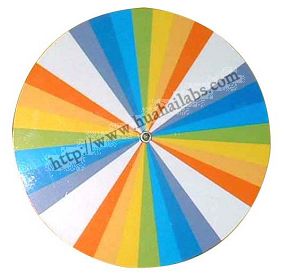 With seven spectrum colors: red, orange, yellow, green, blue, indigo and violet. By rotating the disc, the seven-color-light can be combined into white light.