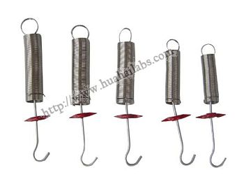 The set contains five springs, each with different coefficient of elasticity. Springs are ended with the ring on the one side and the hook with pointers on the other side. It can be used for determining of springs coefficient and testing of spring elongation dependence on force applied.